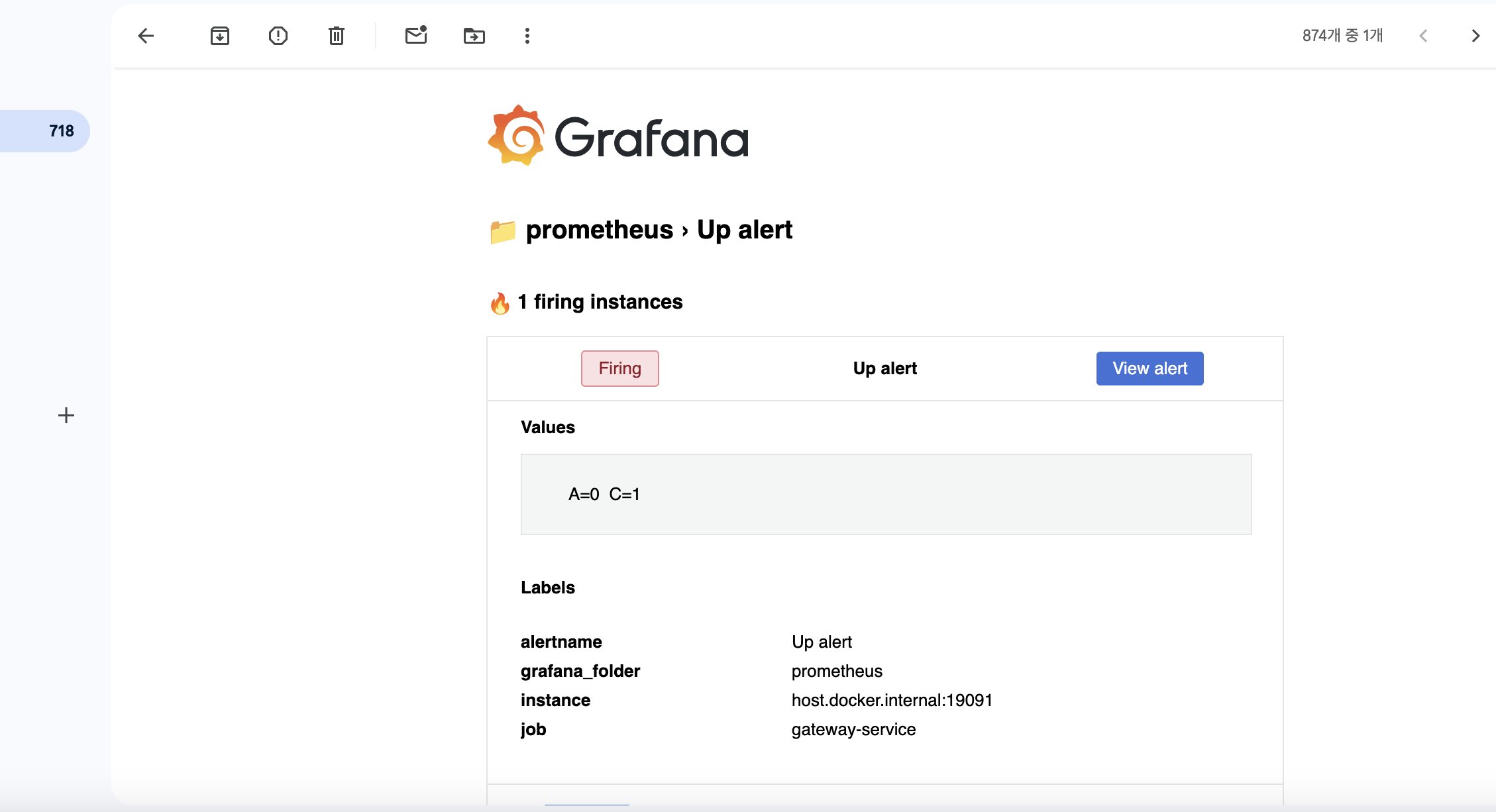 up{job="gateway-service"}는 Prometheus에서 "gateway-service"라는 job에 대한 상태(UP/DOWN)를 나타내는 메트릭으로,