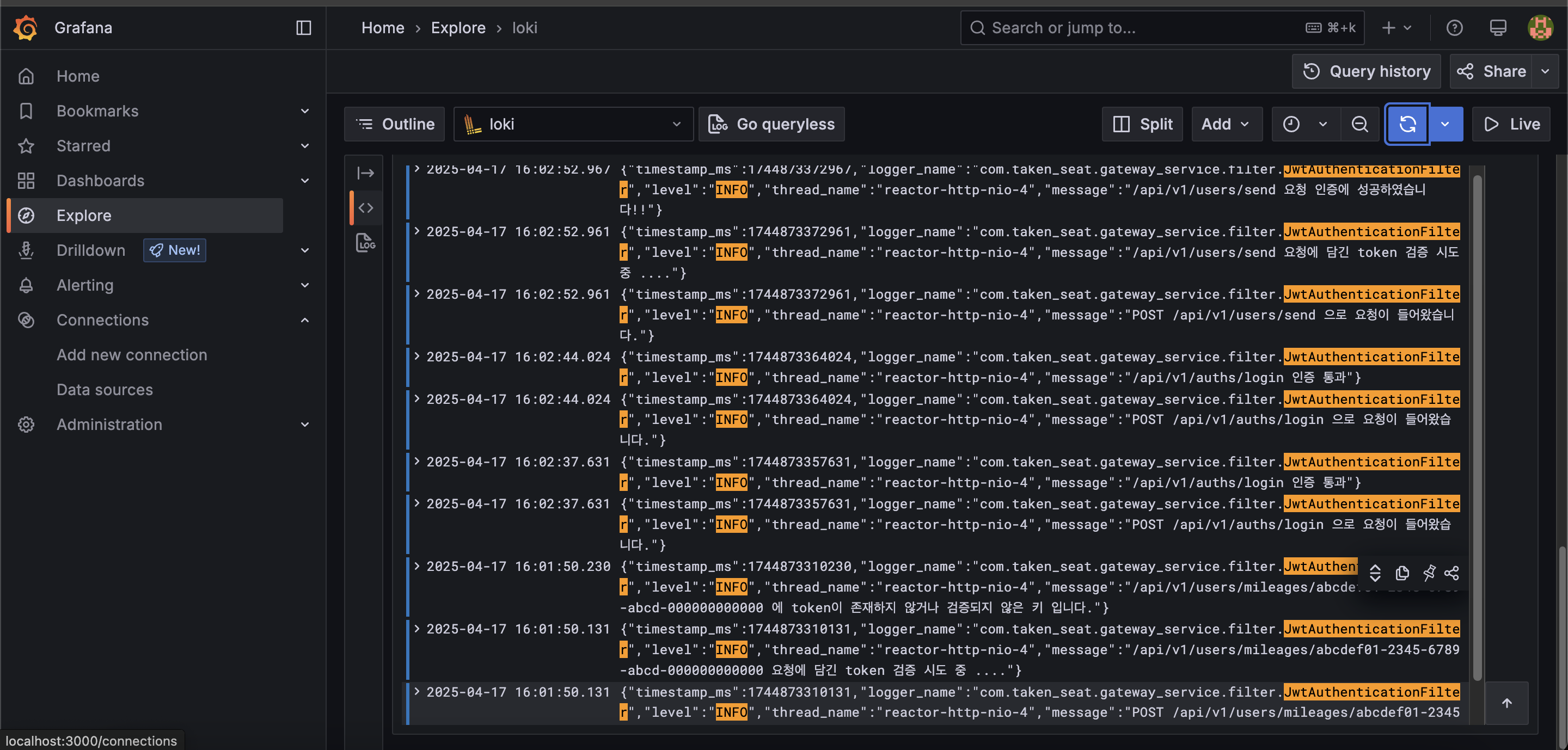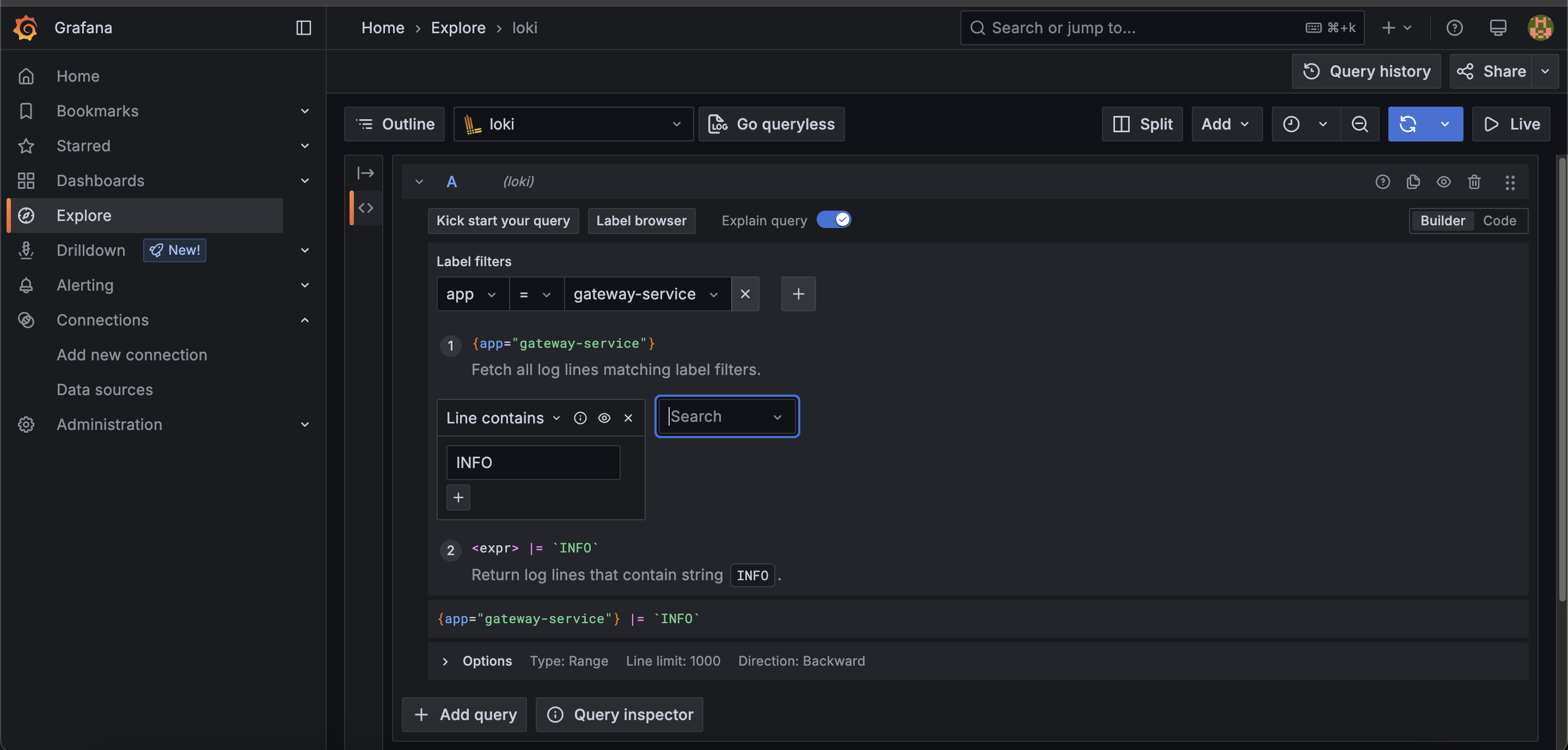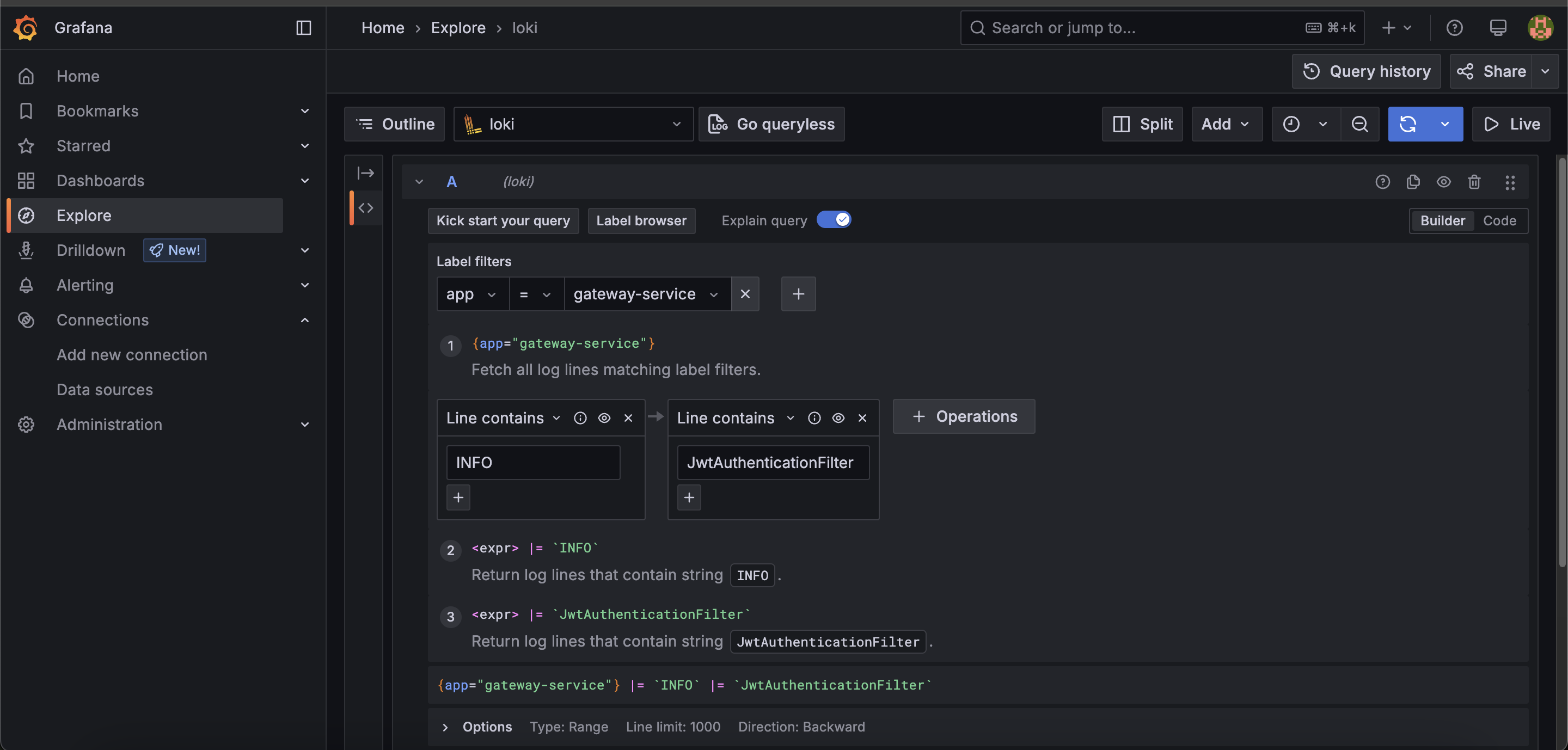{app="gateway-service"} : spring.application.name=gateway-service 로 설정한 모듈의 이름