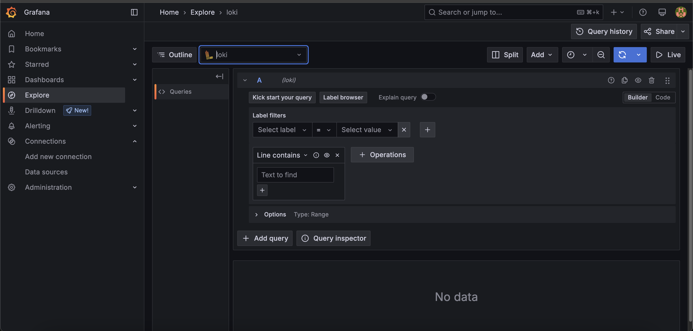 LogQL을 사용해도 좋고, 간편하게 Label filters와 Line contains로 작성해도 좋다.